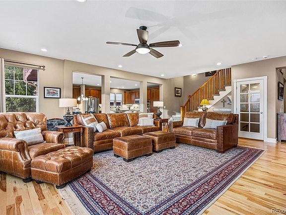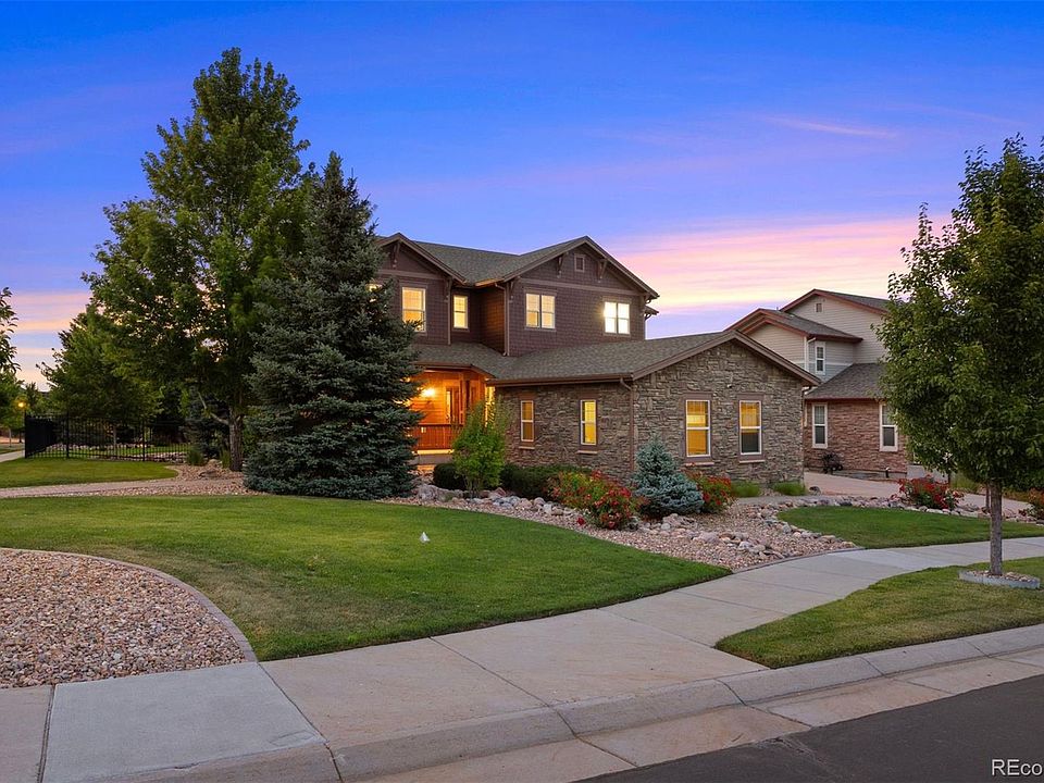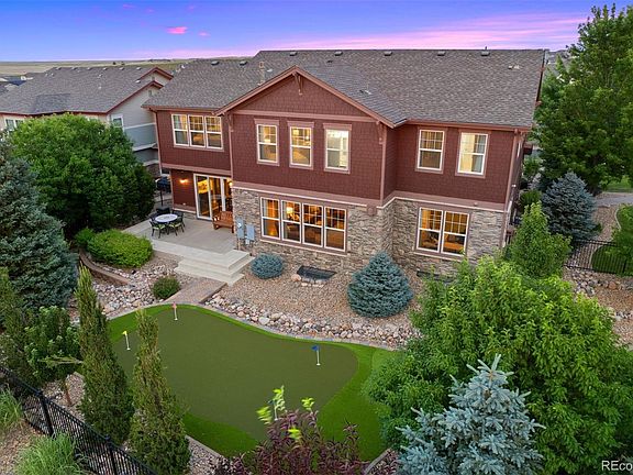 Price reduced $15,000 to $884,500! This elegant 2 story home in Blackstone Country Club is a tremendous value for this golf course community with abundant parks, trails, and amenities. The home is conveniently located on a corner lot in southeast Aurora with proximity to dining options at Southlands Mall; brand new Woodland Elementary a couple blocks away; and easy access to Denver International Airport. You will love meeting friends for dinner at the clubhouse as a social member by living in Blackstone. The pool, tennis courts, and private pickle ball courts are all included. The fitness center has been recently renovated and will save you from having to join a separate gym. Entering the home from the covered front porch you will notice the exceptional landscaping and walkways surrounding the property. The foyer is welcoming, and a charming living room is a great place to meet guests and chat by the fireplace. The great room is so expansive that you have plenty of space for a sectional couch and TV viewing. The gourmet kitchen with eat-in breakfast area has all the things you would want to prepare some epic meals, i.e double ovens, gas range, stainless appliances, granite counters, and tile backsplash. This kitchen area also flows nicely to the backyard patio with putting green and exceptional landscape lighting the trees. Upstairs you will find a glamorous primary suite with 3 extra bedrooms. In the finished basement you can play a game of pool in the rec room and settle in for movie night in the home theatre. There is also a wet bar and an additional bedroom & full bathroom in the basement. This home has so many extras including - main floor office, custom blinds and window coverings, wood flooring, oversized 3 car garage, 3 fireplaces, his/her walk-in closets, and more.