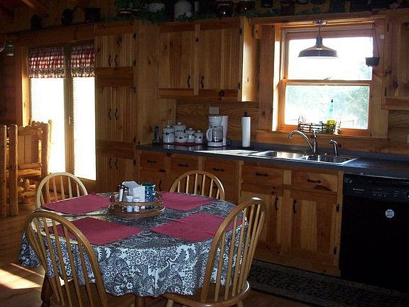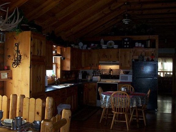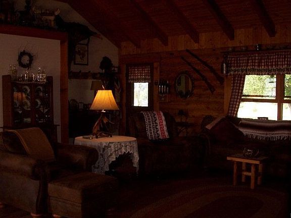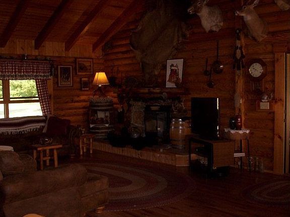 REDUCED! Surround yourself with natural beauty in a log home! One-floor, open concept w/Cathedral ceilings; Custom-made knotty pine kitchen & bathroom cabinetry; New roof, updated septic sys.& newly-stained exterior. Lg.deck(565 SF)for entertaining; Beautifully landscaped. Att'd garage and 2-car det.Handyman's Special garage w/workshop & deck; Lg. blacktop drive; Includes 1 yr.home warranty.