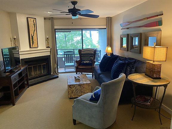 Lake George - Sagamore Resort Condo - This end unit has extra windows allowing lots of light to stream into the living areas. Located in building 7, right behind the boat docking area gives enjoyable views of the lawn area, boating and water activities. Only a short walk around the building at Lake or jump in your boat and enjoy the beauty of Lake George. This well appointed unit has a galley kitchen with stainless appliances, counter bar and full dining area with built in storage units. The living room has a fireplace and sliding doors opening onto the covered deck overlooking lawn area. The lg guest bedroom with full bath, has plenty of room for sleeping areas. The master suite on the second level has an open deck looking west. Sag tennis, golf, fitness, dock memberships available