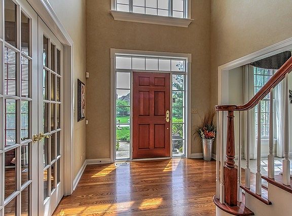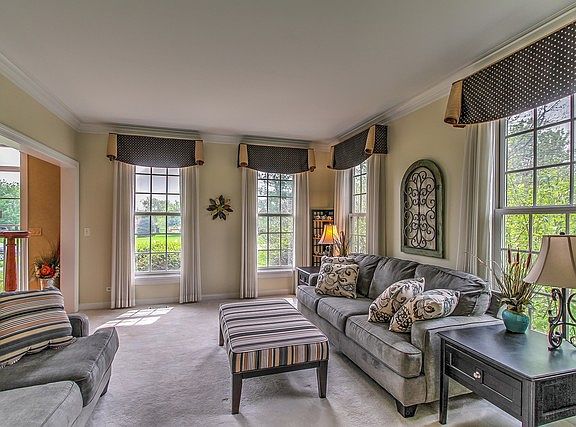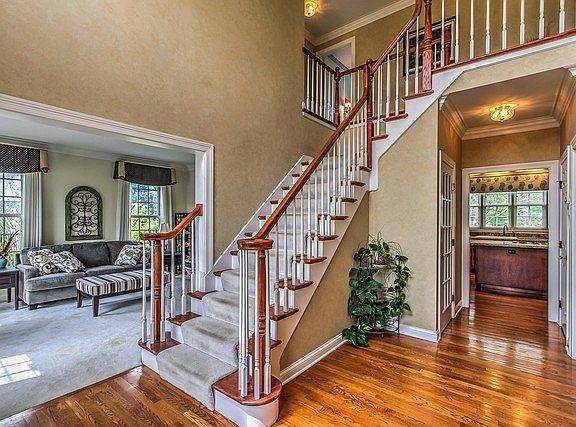 First floor: office with built in shelves, living room, kitchen with island and separate eating area, family room, living room mudroom/laundry room, half bath. Second floor: 4 bedrooms, 3 bathrooms. Master has two closets one of which is a large dressing room, the bath has a shower and separate jetted tub, jack and jill has tub with shower and separate vanities for each room, third bath has a shower and is private to a bedroom. Basement: includes a finished part and an unfinished part for the mechanicals and storage. Finished section includes a great room, extra room, and bathroom. Exterior: The house is on an acre lot professionally landscaped with a patio, large lawn, multiple mature trees, ornamentals, and a couple of raised beds for vegetable gardening.