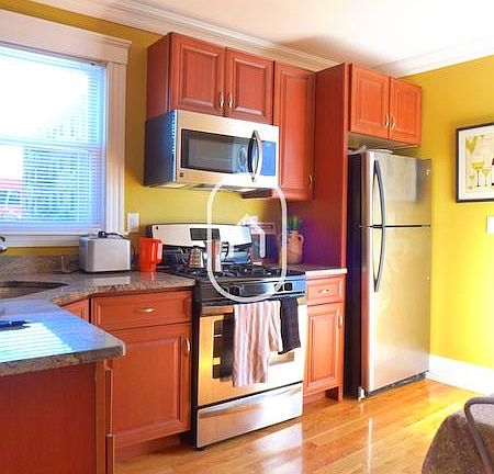 Gorgeous fresh renovation Two bedrooms, one bathroom Second bedroom used as office/study Stunning hardwood floors Granite/stainless appliances Custom cabinetry Marble bathroom Enormous walk-in-closet Skyline views of Boston Private terrace Prime Longwood Medical location Steps away from E Line and 66 Bus Short walk to D line/Brookline Village Laundry machines in building Located in two family house All new plumbing and electrical 95% efficient gas heating Students are not allowed Pets are not allowed