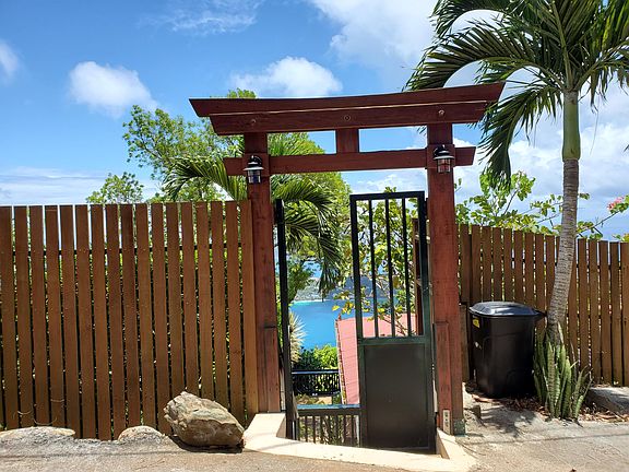 A terrific home built strongly of white cedar logs, overlooking views of Magen's Bay, the beach and down island to British Virgins. Main level is two bedrooms, two baths and downstairs is a great little studio apartment with a great past history of AirBNB rentals. Lots of deck and patio entertaining areas, hammock, hot tub, BBQ w/ sink. And best of all 34 solar panels and 2 Tesla powerwalls for all your power needs.