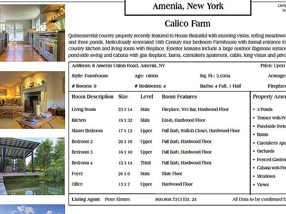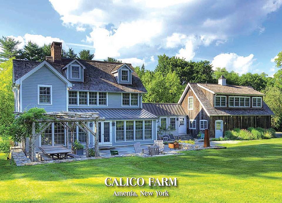 Calico Farm was completely renovated in 2009 by a specialist in restoring old homes. The gut renovation enlarged and upgraded existing space and added 2 extra rooms and a larger kitchen and dining room. It has refinished reclaimed wood from VT for flooring and siding. An extra master bedroom was created over the existing 2 car garage. An enlarged kitchen with expansive windows facing south has beautiful stone counters and custom cabinetry. All the bathrooms are modernized and the house has liberally used wainscoting, wallpaper and sisal rugs. The interior of house was decorated by well known wife/husband team from NYC and the house has been featured in their book and in several design magazines. The house has a central A/C and heating controlled by Nest, a propane backup generator, 200' well and modern pump and water softener, fireplace, and modern utilities including Meile W/D in a separate modern mud room. The 5 acre plot for the main house also includes 2 barns with a guest cottage on the second floor of one, with full bath and kitchen, not included in the room count. In 2018 a 20x50' gunite pool and 8x8' hot tub was installed with a 15x70 bluestone patio, all placed by a large deer fenced enclosed vegetable garden with 12 raised beds. The house also has an additional adjoining 18 acres of land, which is adjacent to a tree nursery and working farms. The undeveloped pasture land has rolling hills and includes 3 ponds, the largest of which has a modern screened and roof shaded elevated deck patio, fireplace, dock and rope swing. The house, its adjacent bluestone decks with surround rock walls and the pool area all have long unobstructed views toward the mountains in adjacent Sharon, Connecticut with no visible other homes.