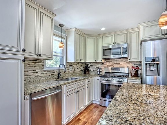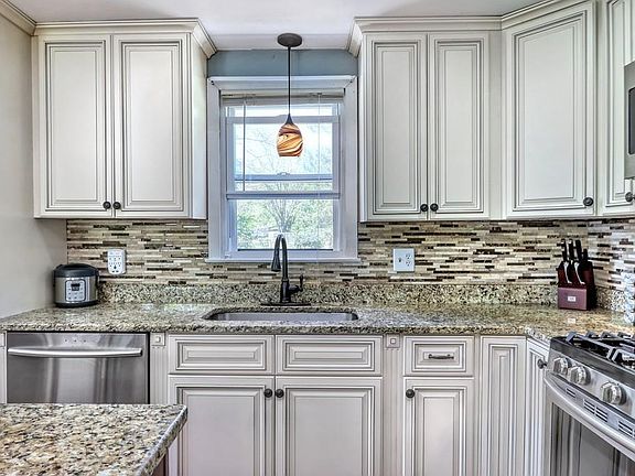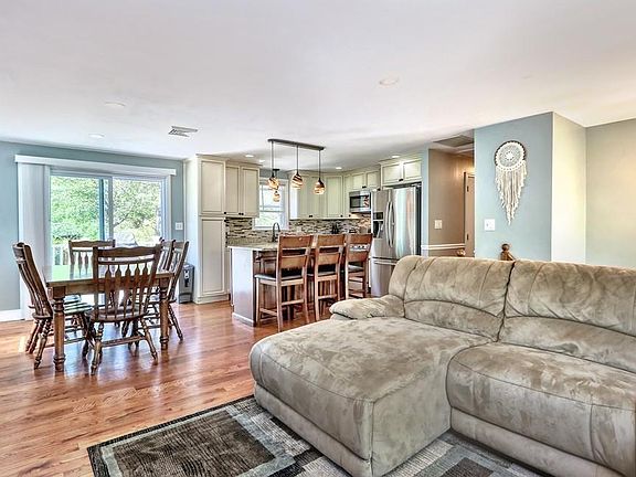 Dreaming of your first home? Looking for a FANTASTIC location in popular neighborhood and minutes to highway? This is it! Nestled on a tree line street with horseshoe driveway, welcome to 8 Axletree. Layout was expanded by opening the walls to create a space that is warm and inviting. Open concept combines 3 rooms into 1. Modern white glazed cabinets fill the space with storage, cooking area, island sits in the center of the room and offers additional seating and countertop space. Spacious living room with picture window and hardwood floors. Large dining area sits off to the side and seats as many as 8. Slider leads to composite 10x10 deck that overlooks a great back yard that is level with space to play/entertain. Storage shed too. Downstairs you'll find 2 more living spaces, full size windows, storage/workshop, modern 1/2 bath/laundry. Front to back living area with wood stove to warm you on the cooler nights. 2nd living area doubles as 4th bedrm/playrm/office. So much to love!