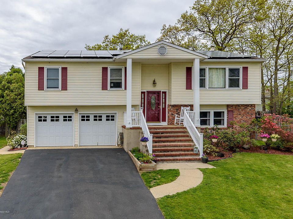 Beautiful 4 bedroom and 3 full bathroom bi-level home on a quiet cul-de-sac street. Recessed lighting,oak HW & laminate floors can be found throughout the home. The ground floor boasts a spacious family room with a wood burning stove and built-in shelves, laundry room, full bathroom and large bedroom. The formal living room and dining room can be found on the first floor. Dining room offers sliding doors onto deck. Eat-in-kitchen with oak cabinets. Master bedroom features an attached master bathroom. Home has an air purification system installed. Fenced-in back yard offers an in-ground pool with new liner & filter, deck, patio area. There is also landscaped lighting and outdoor GFI outlets. Garage converted into bedroom & separate 4 ft storage area in front. Solar panels! A gem! Book today