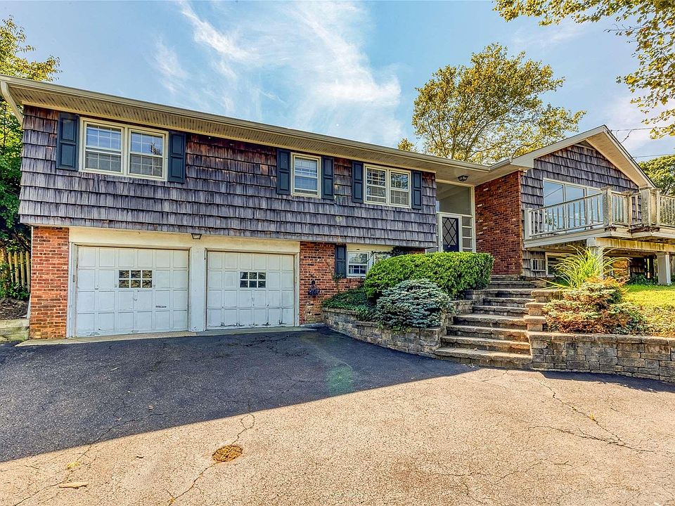 Amazing potential in this 4/5 bedroom high ranch perched above on a private road with beach access and beautiful waterviews of Huntington Bay! This home is surprisingly larger than it appears! Upon entry to the front the stairs lead to an inviting entry foyer with access to most rooms in the house and sliders that lead to a rear deck and yard space. The living room boasts floor to ceiling windows showcasing the breathtaking waterviews also from the front deck. Adjacent to the living room; a generously sized formal dining room perfect for entertaining. The kitchen is light and bright with a large breakfast nook and entry to the side yard. The hallway leads to the primary bedroom featuring two closets and an ensuite full bath. An additional three bedrooms and full hall bath complete the main floor. The lower level includes a spacious den w/woodburning fireplace, utility room with storage, separate laundry room, additional full bath, fifth bedroom or office and access to the two car garage. Other features of this home include wood floors, Wincoma Beach Association (with additional dues) and newer hot water heater 2020. Embrace the renovation possibilities...Don't miss this great opportunity in Huntington Bay!!, Additional information: Appearance:Good,Separate Hotwater Heater:yes