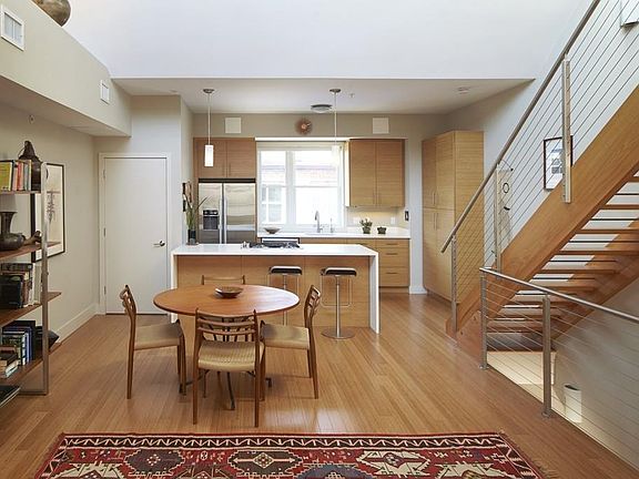 This contemporary townhome condominium near Inman, Harvard and Central Squares offers open and airy luxury living! With 4 levels of sleek, energy efficient design, the plethora of windows, open floor plan and 9 foot ceilings create an oasis for modern living. The entry level includes a study area, large closet under the stairs, heated garage and storage. Second level features master bedroom with oversized closets, master bath with oversized glassed-in shower with stone floor, second bedroom, full hall bathroom and laundry closet. Third level boasts a soaring cathedral ceiling and light filled open-floor plan living/dining/kitchen area with island/breakfast bar, Bosch oven, dishwasher and refrigerator, Jenn-Air cooktop. Design details include bamboo floors, floating oak stairs with steel cable railings. The fourth level features an open study and access to roof-top deck with fabulous views of Boston. Near fabulous restaurants, shops and retail. Walking score of 93.