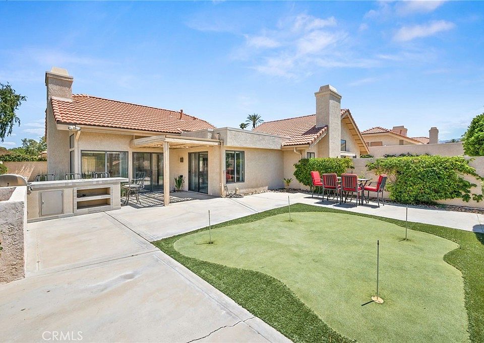 Premier Corner Lot in Guard-Gated Silver Sands! This is a rare opportunity to own one of the most desirable lots in the prestigious Silver Sands community. This beautifully upgraded single-level G-plan home sits on a premium corner lot, offering one of the few private yards in the development with unparalleled mountain views and direct access to two pools and spas just steps away. Featuring two spacious en-suite primary bedrooms, this highly sought-after floor plan boasts soaring ceilings and a completely open layout filled with natural light. The interiors have been tastefully reimagined with contemporary flair, including wood-look tile flooring, fresh bright paint, and stylish metallic tile accents. The chef’s kitchen is open to the living and dining areas and showcases modern walnut-toned cabinetry, white quartz countertops, custom backsplash, stainless steel appliances, and a raised breakfast bar. The great room is surrounded by windows and anchored by a cozy fireplace—perfect for cool desert evenings. Both primary suites offer upgraded bathrooms with quartz counters, walk-in showers with wood-look tile surrounds, and generous walk-in closets. What truly sets this home apart is the expansive private yard—a rare find in Silver Sands. Ideal for entertaining or relaxing, it features: Multiple patio areas for al fresco dining, Built-in BBQ with bar seating, Fire feature for ambiance, A putting green for added fun, Direct gated access to two nearby pools and spas. This fully furnished move-in-ready gem combines luxury, privacy, and unbeatable location within one of the desert’s most coveted guard-gated communities. The SILVER SANDS RACQUET CLUB is a gated community with 256 homes...located adjacent to the J.W. Marriott Desert Springs Resort and across from Desert Willow Golf Resort where Palm Desert homeowners can play for reduced rates. The complex features club house for social activities, 7 lighted tennis courts, 4 pickleball courts, tennis and pickleball pros on staff in season: fitness center and 15 pools/spas which are all included in the HOA dues. HOA dues also include roof, exterior maintenance, cable TV, internet, tennis, pickleball, trash removal and security. Silver Sands Racquet Club has everything to make everyday a vacation!