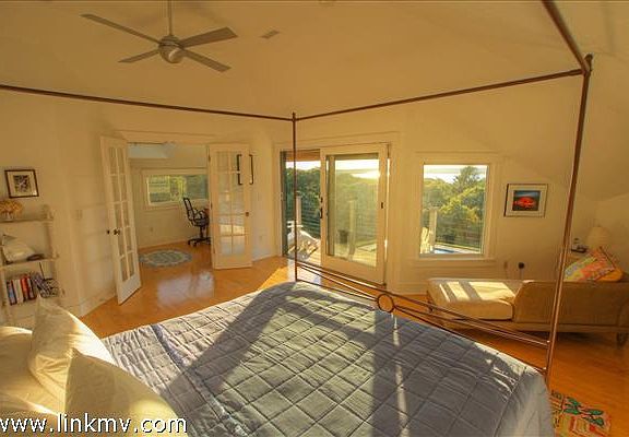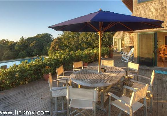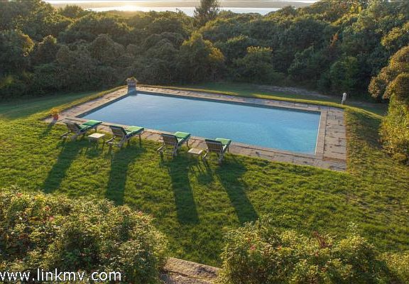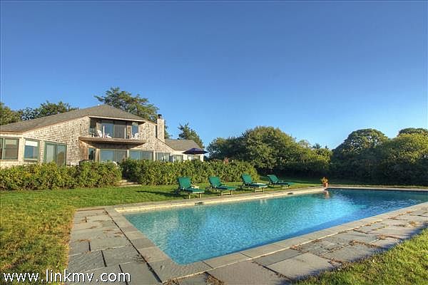 Within walking distance to Chilmark center and Quitsa boat landing,this 4 bedroom home with beautiful grounds and water views of Menemsha Pond has a light filled interior rising above the in-ground pool. The center of the home with soaring cathedral ceilings has a unique open staircase which leads to the second floor Master bedroom en-suite with study and private sunning deck. Creative designed open living, kitchen and dining areas overlook the pool from every room. 6 bedroom septic provides for 2 additional bedrooms or guest house.