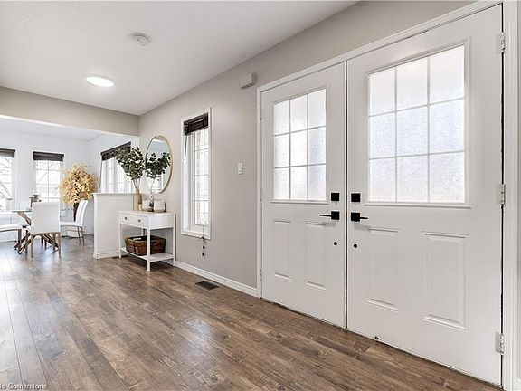 Immaculate 1,833.71 Sq Ft Corner End-Unit Freehold Townhome in Sought-After Binbrook! This beautifully maintained and sun-filled townhome offers spacious open-concept living with tasteful neutral décor throughout. Situated across from a park and school, this home boasts a charming covered front porch and an abundance of natural light. The main floor features a renovated chef’s kitchen with brand-new stainless-steel appliances, quartz counters, stylish backsplash, and an impressive 7 foot island with ample cabinetry. Bonus flex space on the main level is ideal for a home office, den, or formal dining area. Upstairs, the oversized primary suite includes a luxurious 4-piece ensuite with corner soaker tub, separate shower, and an impressive walk-in closet with custom built-ins. Two additional bedrooms share an updated 4-piece bath. Enjoy the convenient upper-level laundry. Outside, relax or entertain on the 2-tiered deck (8x10 upper & 10x16 lower) in the fully fenced and gated backyard. Includes inside garage access. Don’t miss your chance to own this exceptional home in a growing, family-friendly community!