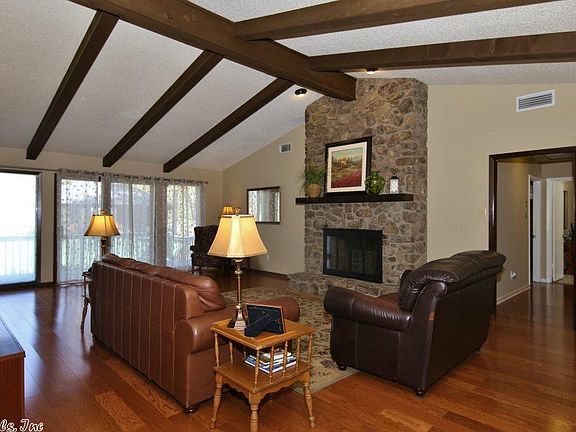 Wonderful family home on quiet cul-de-sac in Don Roberts/Pinnacle View school districts! Fabulous GR w/vaulted ceiling, stone FP & floor-to-ceiling windows that look out on .75 acre wooded vista. Large remod. eat-in kitchen; master has remod. bath & huge walk-in closet; 2nd guest BR on main level. Plus, lg. downstairs den w/FP, 2 BRs, full bath & bonus room w/Murphy bed! Lots of parking space (RV!)! A wonderful deck & a gazebo w/WB stove round out this special property nestled in a desirable neighborhood!