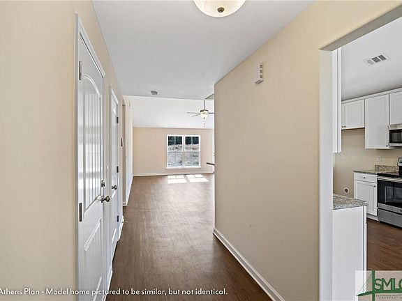 The Athens by Lamar Smith Homes: efficient living at its best! One look at this one-level Georgian Collection and you will agree. As you step in, the bright, airy great room welcomes you with its cathedral ceiling and open design. Imagine basking in the light from the wall of windows that span the rear of your spacious great room. At the center is an island perfect for gatherings. Entertaining is easy: your guests can stroll from here out to the covered patio area. This smartly designed kitchen connects to a large breakfast room and has ample countertop space, stainless steel appliances and 42" cabinetry. Not to be overlooked, this split floor plan ensures the master suite its privacy and offers two perfectly-sized bedrooms. With double vanities in the master bath, designer light package, spray foam insulation, a finished two-car garage and fully sodded yard, this is a must-see on your dream home shortlist! Estimated completion: Fall 2020. Lot 98