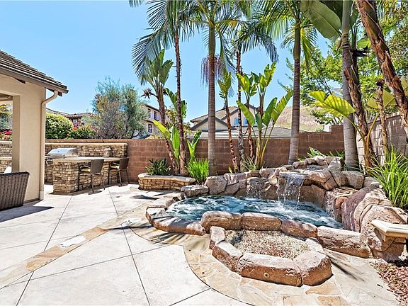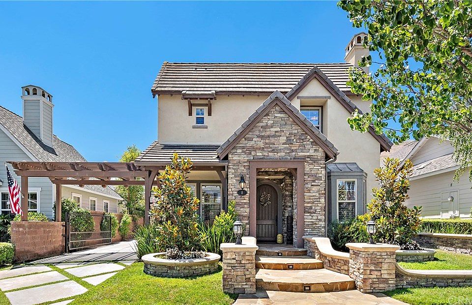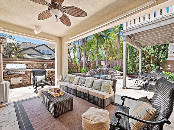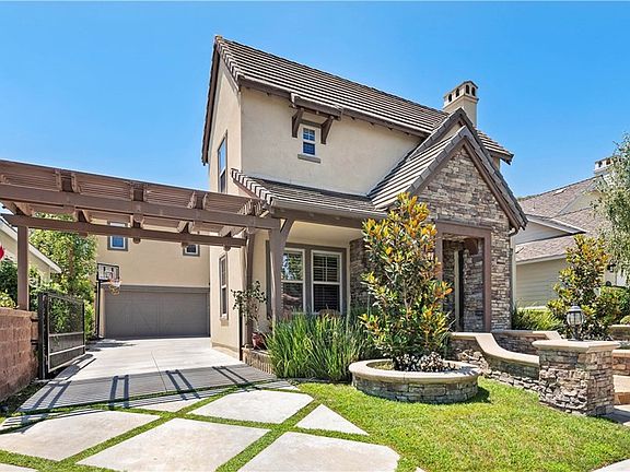 Settled on a tranquil cul-de-sac street at Evergreen in Ladera Ranch, this charming cottage-inspired home showcases an extensive brand-new remodel & the addition of a full bed-with-bath ensuite on the main floor. Now hosting 5 bedrooms and 4.5 baths in approx. 3,323 s.f., the move-in-ready residence is refined, luxurious & fully customized inside & out. A handsome beamed ceiling crowns a formal dining room & a formal living room w/ fireplace, & the casual fireplace-warmed family room hosts a built-in entertainment center and surround sound. Genuinely impressive, an all-new kitchen surpasses the expectations of demanding chefs w/ amenities that include Calacatta quartz countertops, full subway-tile backsplash, all NEW custom white cabinetry with pull-outs, amazing island, wine fridge, Restoration Hardware lighting, & Dacor appliances complete w/ a built-in refrigerator. Upstairs, a sumptuous master suite is home to a private balcony, chic bath & a walk-in closet w/ built-ins. EPOXY PIPE, OWNED SOLAR, WHOLE HOUSE FAN, crown molding, custom window treatments, designer lighting & new paint lend added appeal throughout. Curb appeal reaches new heights thanks to beautiful landscaping, a covered front porch, a long driveway w/ classic porte cochere. Entertain stylishly in a private backyard with a fire pit, loggia, rockscaped spa w/ refreshing waterfall, & a custom built-in BBQ bar. Evergreen places residents close to acclaimed schools, parks, pools, trails, shops and restaurants.
