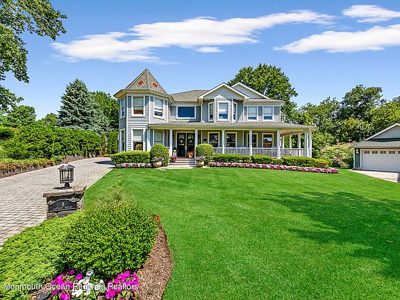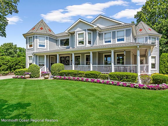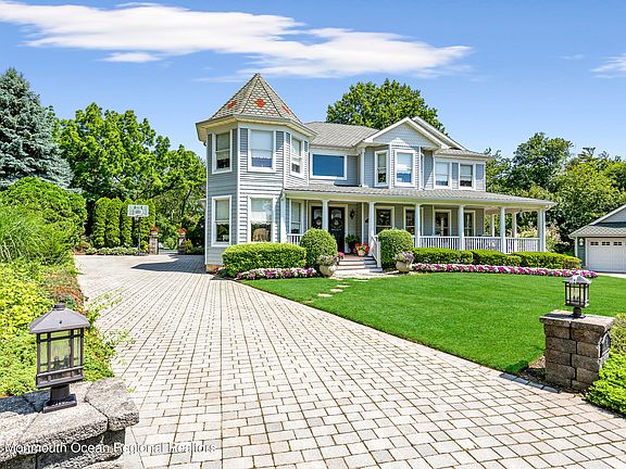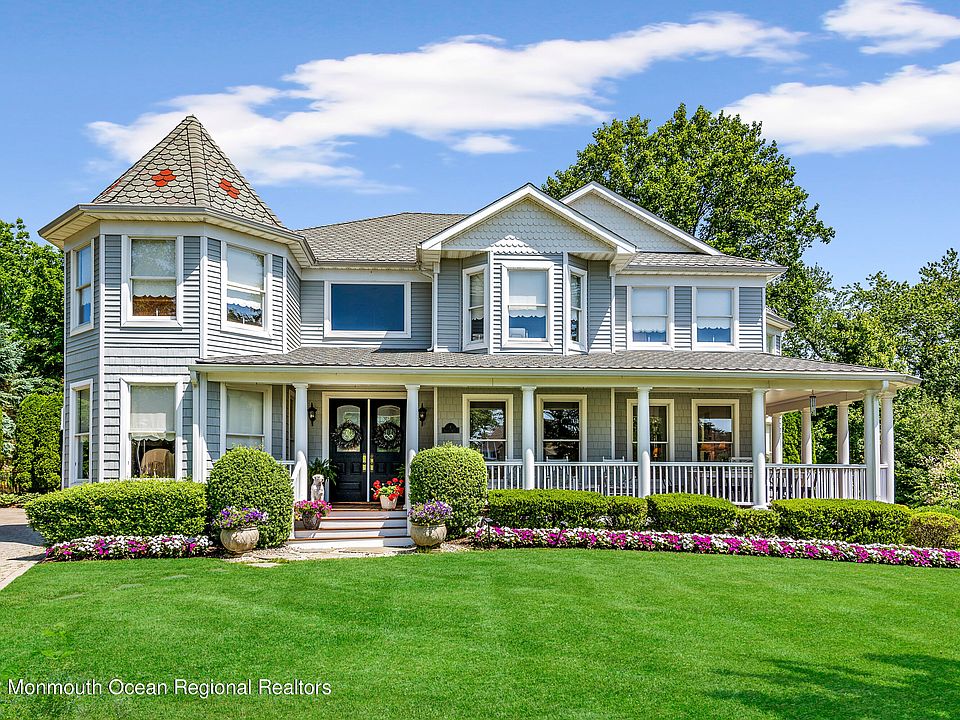 Private oasis situated on almost an acre of land in the sought-after town of Brielle. This magnificent custom-built Victorian home boasts a private cul-de-sac located in walking distance to Main Street, Manasquan. Here you will enjoy fine dining and quaint boutique shopping. Also located at your fingertips are local beaches, marinas, and parks. This resort-like property is designed for entertaining with a serene pool surrounded by lush, beautifully landscaped grounds and a sweeping patio- the perfect sanctuary for outdoor living. The moment you step foot on the gracious wrap around mahogany porch, you will be impressed with all the details this home has to offer. You are immediately greeted with a dramatic two-story foyer which flows effortlessly into the oversized living area First floor features guest suite with private bath, home office/flex room, generous formal dining room, and gourmet chef's kitchen with eat-in dining area. Kitchen adorned with custom solid cherry cabinetry throughout, oversized island, Wolf range, and built-in refrigerator. Also, not to be missed, is the finished basement with an abundance of storage. Expansive 2nd floor offers 5 generously sized bedrooms and 3 full baths. Primary suite features vaulted ceilings, seating area with fireplace, custom closets, and gorgeous sun-drenched spa-like bathroom. This home truly has it all!