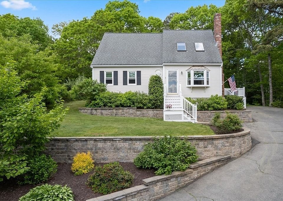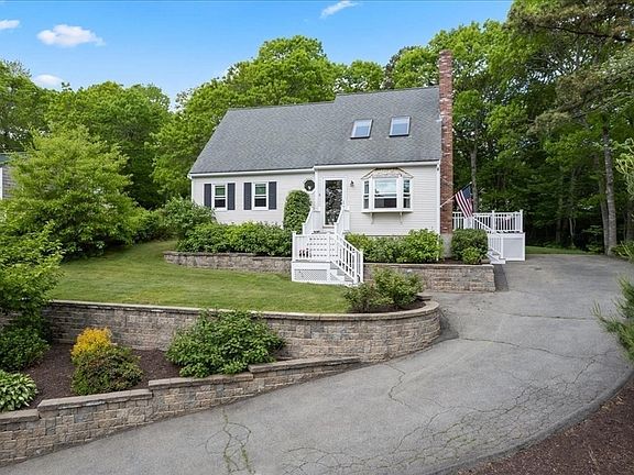 Offer Deadline: 4PM Monday 6/10. Welcome to this charming Cape-style home in West Wind Shores! Enjoy tranquil water views & deeded access to Big Sandy Pond, perfect for swimming, boating & fishing. This well maintained property offers comfort, style, recent updates & is move-in ready. Located within 5 miles of the best golf courses in Plymouth County, Spacious Living Room features fireplace & soaring vaulted ceiling w/skylights, creating a warm inviting ambiance. Large windows provide natural light & picturesque views. Recently updated eat-in Kitchen w/modern appliances, ample cabinetry & stylish design. 3 generous sized Bedrooms, 2 are on Main Level for added convenience. Den/Office upstairs currently set up as 4th bedroom. Finished Basement w/extra living space, ideal for recreation room or gym. Beautifully landscaped w/perennials & stone retaining walls. Relax on the large deck w/water views while the private backyard w/Shed offers space for outdoor activities & storage.