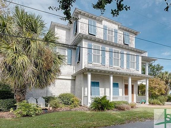 Twist the doorknob to be welcomed into a true Tybee Island beach home at 8 Center Place, 3rd lot back from the ocean, on a private lane located mid-island, in an X flood zone. This custom-built Cape-Cod style home was constructed in 2003 with every detail in mind and nothing overlooked. The open living concept on the main level is perfect for entertaining in the generous kitchen and great room which open to a wide covered porch to take in the ocean breeze. Features include top of the line appliances, informal dining, fireplace flanked by bookcases and dry bar, beautiful hardwood flooring, coffered ceiling, Marvin windows and doors and plantation shutters. 2 guest rooms are also located on main level. The top floor includes a spacious master suite with views of the ocean and passing container ships from covered porch and sun deck plus an en-suite guest room. Other features include elevator shaft, outdoor shower, 6 car carport, shallow well irrigation and full bath on ground level.