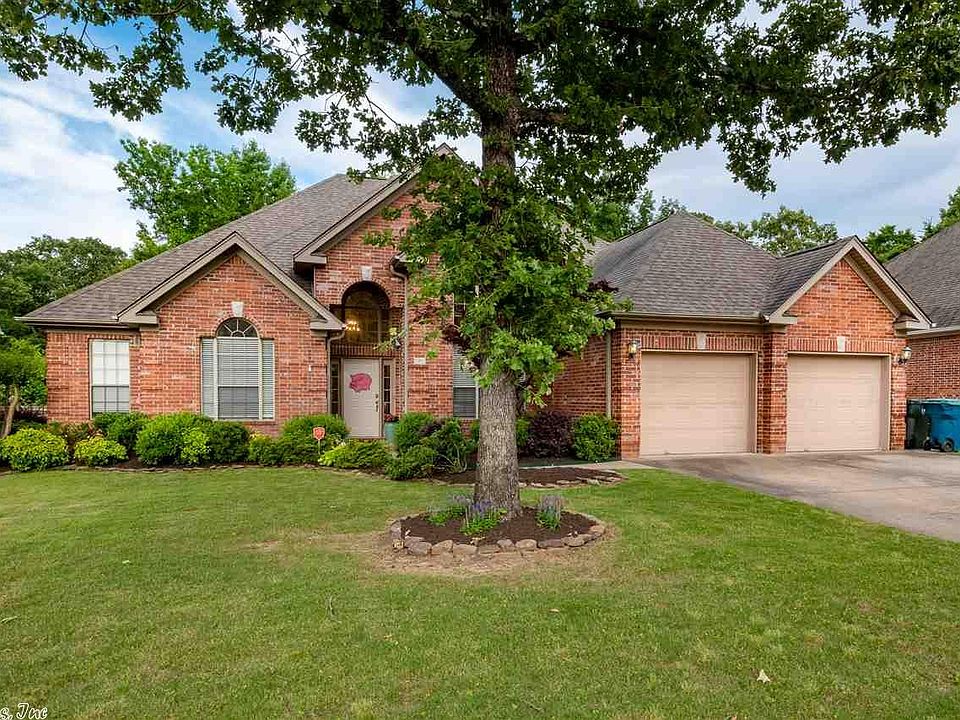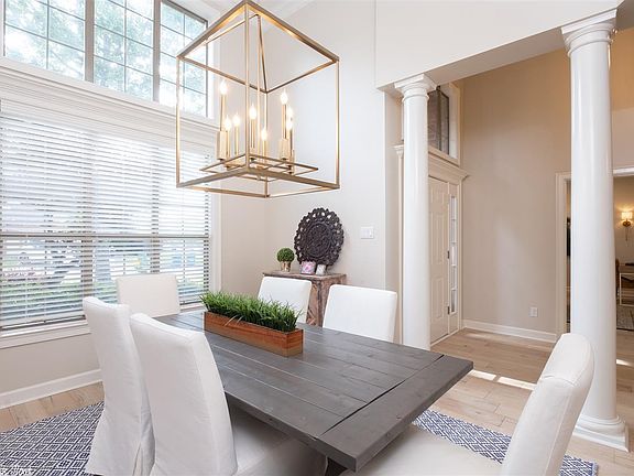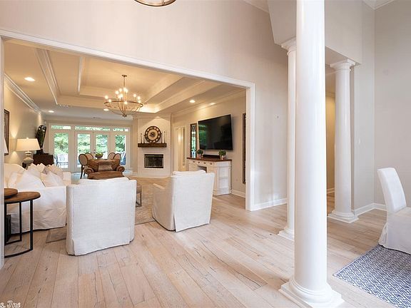 All brick, one level showcase! $75,000 in updates. New white oak hardwoods, fixtures, paint, hardware, recessed lighting - open floor plan. Open kitchen into hearth room- two living areas w/see thru gas fireplace. Quartz counter tops, white subway tile backsplash, stainless appliances, breakfast bar. Split master plan, large dining & optional office- versatile. Mudroom area in large laundry. French doors onto cozy, private wooded level backyard green space. Renovated elegance in terrific neighborhood.