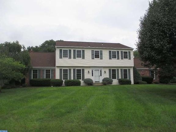 Welcome home to this four bedroom center hall Colonial nestled on a pristine half acre lot in the desired Ridings neighborhood. Foyer entrance with hardwood floors and spindle staircase accessing the light & bright formal living room and dining room with their crown & chair rail moldings and front yard views. The kitchen with breakfast room features lots of oak cabinets and counter space, Kohler sink with gooseneck faucet, pantry closets and windows with backyard view. A mud room with laundry has backyard and garage access with cabinets and double wide closet. A family room off the kitchen boasts stained wood trim, chair rail & beam ceiling, wood-burning brick fireplace with wood mantel, sliding doors to the backyard patio and access to the study with pocket doors and built-in book shelves. Upstairs find a large master bedroom suite featuring a dressing area with vanity & sink, walk in closet & full bath with stall shower. In addition, three large bedrooms light & bright with plenty of windows, double closets and tiled full hall bath with double sink and tub/shower combination. A full, unfinished basement(33x25) with high ceiling can be finished for multiple uses, 2011 water heater and French drain system. Oversized 2 car garage with peg board walls for organization. The living area extends outside with a brick walkway & patio with retractable awning, mature landscaping & garden beds, decorative wood fencing and beautiful 30x18 in-ground pool with concrete apron. Several rooms have been freshly painted. Convenient to shopping, schools and parks. Minutes from NYC/Phila train stations and major roads. Award winning Ben Franklin Elementary school. Come take a look - you will not be disappointed.