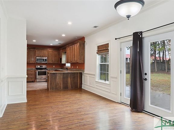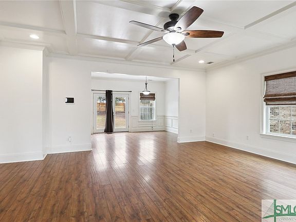 Beautiful Brick home close to I-95, HAAF, Ft Stewart and GulfStream. Come on in and you will notice the beautiful and spacious living room with coffered ceiling detail, the living room overlooked by the dining room, which has plenty of space for large furniture pieces. The kitchen boasts custom wood cabinetry with beautiful detailing, granite countertops, and SS appliances, pantry, & a large additional closet that could be used as a 2nd pantry if you like!! The oversized laundry room is on the main level and includes washer/dryer/mud sink and built in drop zone! Upstairs you will find 4 spacious bedrooms, all with walk-in closets!! The primary bedroom is huge with en-suite bath that includes tons of storage, dual vanities, two linen closets, garden tub and shower. You will also find a hall bath with dual vanities and linen closet. Out back you have an oversized patio with pergola, fenced in yard and a fire pit. Don’t wait to make this home yours!