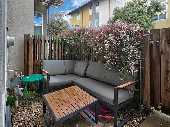 All the pleasures of townhouse living with the privacy, space, and comfort of a Single-Family Home. Nestled in the gated community, West End Commons, this detached, two-level home is spacious and highly efficient. With 1,153 square feet, you'll find one-and-a-half bathrooms and two bedrooms located on the upper level and the graciously large living area on the ground level. Soaring ceilings complement the open living space that is ideal and impressive: an entertainer's dream. A beautiful kitchen has granite countertops, gas cooking, and plenty of counter space. A deeded parking space, in-unit laundry, and cozy outdoor patio sweeten the deal. Carport and outdoor furniture, wardrobe and china-hutch are all included. The surroundings are convenient with gorgeous walking paths and easy access to the Emeryville, Berkeley, and Oakland hotspots. Live a luxuriously low-maintenance lifestyle without having to compromise on the benefits of a single-family home. - Tenant is responsible for all utilities (PG&E, EBMUD, wifi) - No smoking of any substances - Tenant subject to adhere to HOA rules & restrictions (to be provided upon accepted rental application) - Small cats and dogs allowed, $50/monthly pet rent. - NOTE: 3300/month unfurnished
