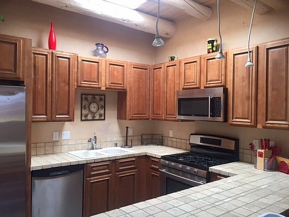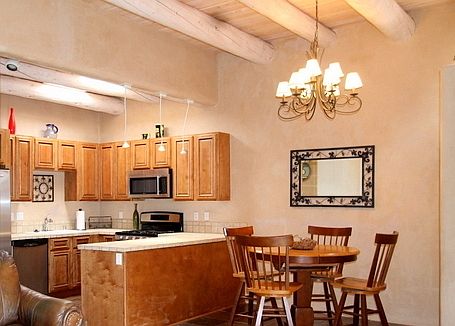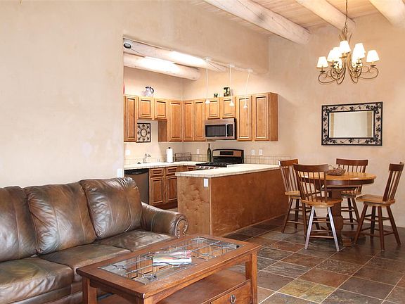 Taos Mountain is at your front door in this spacious contemporary condominium. La Vida Feliz units are built eco-friendly within a quaint, safe, community. The two bedroom two bath unit has an open floor plan creating a flow between the living room, dining room, and kitchen. Mountain views and upscale amenities welcome you home. This unit has a Kiva fireplace, stainless steel appliances, slate tile floors and tumbled tile counter-tops. Recharge in the jetted bathtub or in your private walled in patio hot-tub. Moments from town and minutes from The Taos Ski Valley, this condo is perfect for winter ski trips, summer adventures, and ideal for a full-time Taoseño. This is an excellent place to experience all Taos has to offer.