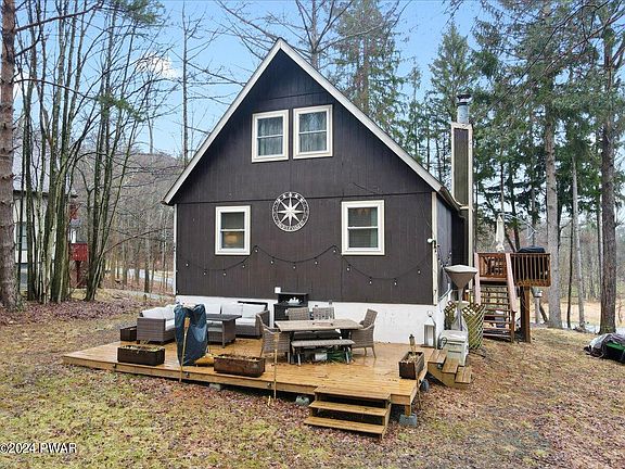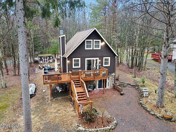 SELLER SAYS MAKE AN OFFER! Welcome to your dream chalet-style home, nestled in the vibrant community of The Hideout, where the tranquil Brooks Lake sets the stage for a serene living experience. This captivating home is a perfect fusion of rustic allure and modern conveniences, designed for those who seek a peaceful retreat without compromising on style and comfort. Upon entering, you'll be enchanted by the soaring vaulted ceilings, the inviting propane brick-face fireplace in the living room, and the charming pine tongue and groove ceilings that grace the kitchen and bedrooms. The abundant natural light enhances the home's welcoming atmosphere, making it a cozy haven for relaxation and leisure. The kitchen, complete with brand-new stainless-steel appliances, is ready for your culinary adventures. Both bathrooms have been elegantly updated and remodeled, offering a touch of luxury and sophistication to your daily routine. The loft area, spacious and versatile, is an ideal space for additional sleeping quarters, a home office, or a quiet reading nook, all while providing stunning views of the surrounding landscape. The home has been thoughtfully upgraded with a BRAND NEW ROOF in 2018, two new sliding glass doors, and brand new windows in the loft and main level, ensuring comfort and peace of mind. Outdoor living is a delight with a newly constructed back deck and a front deck that offers year-round lake views, perfect for hosting summer barbecues or simply enjoying the natural beauty of the Poconos. The property also boasts firepit areas in the front and back, offering cozy spots for evening gatherings and enjoying the lovely lake views. The fully finished walk-out lower level adds a generous amount of living space, perfect for a family room, game area, or additional guest accommodations. The home comes with most furniture included, with a few exceptions, allowing for a seamless transition into your new chalet.