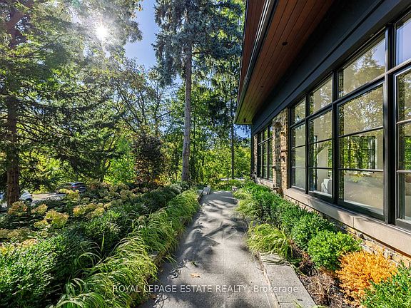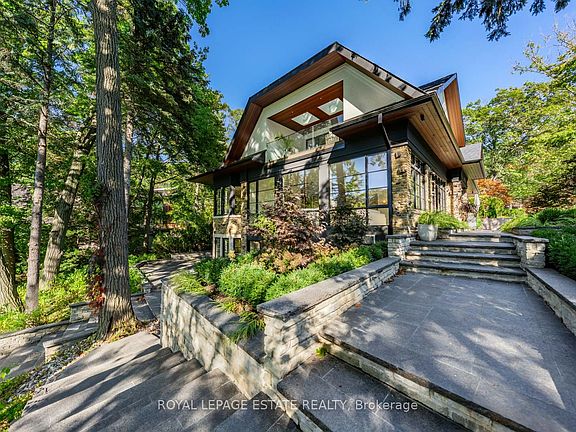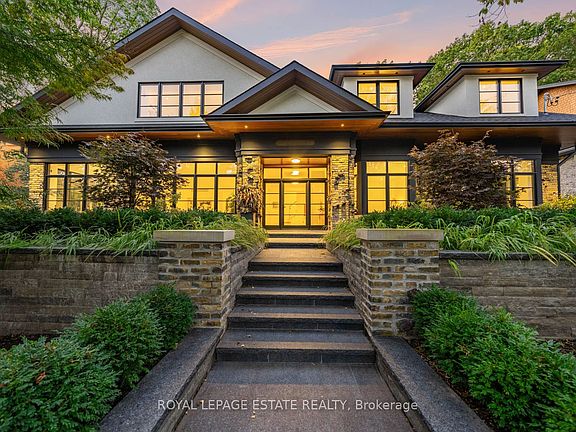 Completely restored and reimagined, Longwood House is a landmark estate in a coveted, private pocket of The Beach. Once the summer retreat of a 19th-century lumber baron, this iconic residence now stands as a masterful blend of historic grandeur and art-deco sophistication. Commanding nearly half an acre across two lots, 8 Crown Park Road sits privately perched at the end of a quiet cul-de-sac, surrounded by the lush beauty of Ivan Forrest Gardens and overlooking Glen Manor Drive and the Glen Stewart Ravine. Inside, the scale is breathtaking with three full levels, seven walkouts, and over 8,000 sq. ft. of living space (Main: 2,871 sq. ft. | 2nd: 2,425 sq. ft. | Lower: 3,074 sq. ft.). Every inch has been meticulously rebuilt with timeless craftsmanship and curated materials sourced from around the world: imported tile from Spain and South America, alabaster lighting in the living room, pantry, and bar, and three custom gas fireplaces wrapped in bespoke marble. The grounds are a private oasis. Over $1M in landscaping includes restored original brick (including rare clinker brick), solid wood soffits, a hydronic heated driveway, walkway, entry, and garage floor, a full-property irrigation system, Ebel stone retaining walls with granite caps, and an expansive rear terrace finished in black granite. Elegant, versatile spaces throughout offer both light and warmth from the stately foyer, sunlit dining room, and Scavolini millwork home office, to the gym, games' room, two wet bars, wine cellar, and in-law suite potential. With wall-to-wall windows framing lush ravine and garden views from every angle, Longwood House truly is The Crown of the Beach, your own private park in the heart of the city.