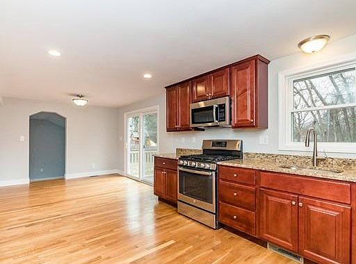 Completely remodeled home featuring three bedrooms, gleaming hardwood flooring, new kitchen with granite counter tops, recessed lights, stainless steel appliances, a newly updated bath with granite countertops, family room with fireplace and wall-to-wall carpet, new deck, new windows. Upgrades include furnace, hot water heater, central a/c, flooring, bathrooms, kitchen, lights, doors, fixtures, paint, etc. This home is ready to move right in. Located on a beautiful professionally landscaped level lot, convenient to major routes, shopping, schools and restaurants.