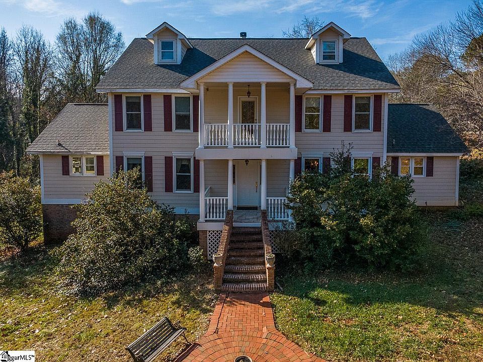 Welcome to 8 Dawson Road in Greenville! This estate-style colonial home offers 5 bedrooms and 4.5 bathrooms and is perfectly tucked away on over 7 private acres, just minutes from Poinsett Highway, Paris Mountain State Park, downtown Greenville, and more. With three full stories and nearly 4,500 square feet, there is absolutely no shortage of space or storage throughout the home. A geothermal heating and cooling system helps keep utility costs low, and you’ll find some fresh paint and new carpet already in place. The third floor includes a bedroom with a full bathroom and a large walk-in storage room. On the second floor, there are three additional bedrooms—two sharing a Jack-and-Jill bathroom and one with its own ensuite—along with another oversized walk-in storage area that connects to the recreation room. This light-filled rec room also features a full bathroom, a third walk-in storage room, and a second staircase that leads directly down to the kitchen. The main level offers a formal dining room, a great room with soaring vaulted ceilings and built-in bookcases, a spacious kitchen with a breakfast area and tall ceilings, a walk-in laundry room, and a half bath. The primary bedroom is located on the main level and includes a large en suite bathroom, with an additional connected room through the bath and closet that could easily serve as a second primary sleeping area, office, TV room, workout space, or sitting room. Out back, the wraparound porch overlooks the expansive yard, and while there is an existing pool on the property, it is not currently functional and will need to be filled in or replaced—please use caution when viewing. A three-car garage completes this incredible property. There is truly so much room here—come see it for yourself!