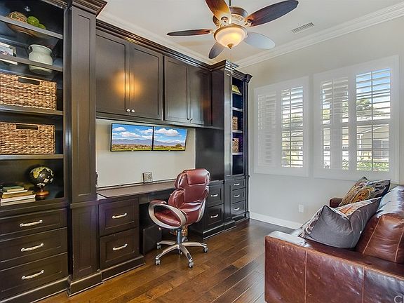 Beautiful 2 bedroom, 3 bath, 1950 square foot executive home is the epitome of elegance and grace. Situated on a premium 5,122 square foot professionally landscaped tranquil lot with sweeping 180 degree panoramic views from back yard. This SINGLE STORY home located in the 55+ GATED community of Gavilan comes complete with a office with built-ins, formal dining room, Hardwood Flooring, elegant Crown Molding, Ceilings Fans, Recessed Lighting, 11+ feet Ceilings, Plantation Shutters, Central Vacuum system, Whole House Water Softener system, Surround Sound speaker system, computerized Nest climate control system and custom Silhouettes blinds. The Chef's Kitchen offers huge center Granite island with Reverse Osmosis System, 5 burner Stove, Stainless Steel appliances complete with custom built-in refrigerator, mounted stainless steel Pasta Faucet and gorgeous cabinetry which lead to the Formal Dining area. A beautiful Family room with custom built Media Niche, Crown Molding, Surround Sound, Fireplace with soaring Coffered Ceiling enhance this open & bright home which leads to the gorgeous California-Room with Fireplace, Surround Sound, Recess Lighting, Ceiling Fans, Water Fountain, Firepit and a spectacular view of the mountains. Master Bedroom Suite complete with Coffered Ceiling, Crown Molding, Walk-in wardrobe closet, Double Vanity & E-Stone Countertops in bathrooms, Laundry room with cabinetry, and custom closet organizers in all bedrooms. A Must See Opportunity!