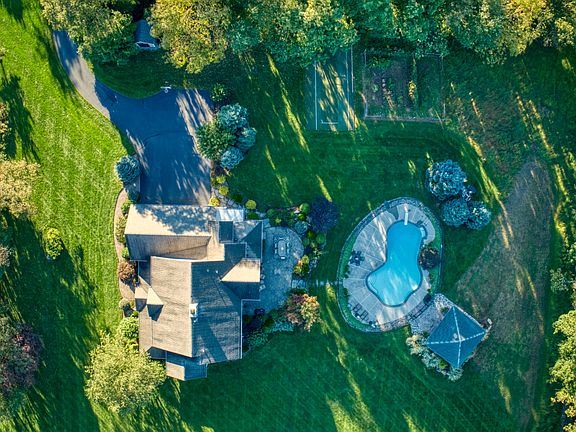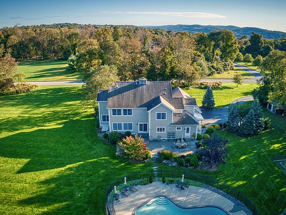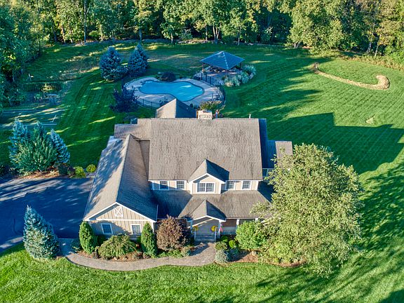 Custom built in 2003 this magnificent 4 bedroom, 3 full and 1 half bath Colonial offering a spacious and open floor plan is for sale by the original owners. Truly move-in ready this pristine home is perfectly nestled on a picturesque 5 acre lot in the desirable Stone Row at Hickory Run neighborhood. A paver walkway leads to the charming wrap around front porch featuring multiple seating areas. Step into the welcoming entry foyer with two coat closets and note all the impressive amenities including oak hardwood flooring, oversized windows, and exquisite molding and trim detailing. Opening on the right of the foyer the large formal living with wide crown molding and direct access to the family room is generously sized for entertaining. To the left of the foyer, hardwood flooring flows into the elegant formal dining room with crown and chair rail moldings. The gleaming wood flooring continues into the open concept kitchen, breakfast room and family room with built-in stereo speakers. For easy entertaining a custom buffet located between the dining room and kitchen offers a beautiful soapstone counter top with storage cabinets and wine refrigerator. The gourmet kitchen features a center island breakfast bar, hi-end stainless steel appliances including a Sub-Zero refrigerator, Bosch dishwasher and GE Profile Series 5-burner gas range and double wall ovens. This impressive kitchen also has abundant maple cabinetry, Corian counter-tops, decorative tile back-splash, organized pantry storage and recessed lighting. The desired floor plan for today's living has the kitchen opening to the large breakfast room and family room with a raised hearth wood-burning fireplace with brick surround and barn beam mantle situated for optimal viewing. The bright breakfast room has sliding glass door to the expansive rear paver patio perfect for parties and barbecues. The spacious family room is the perfect spot for entertaining or quiet evenings at home and has walls of windows offering views of your tranquil property. Currently used as an office the lovely sun room off the family room has slate flooring, ceiling fan and a French door for private access to the front porch. A mudroom with slate flooring has a double door coat closet and a full bath with a granite topped cherry vanity and large stall shower with decorative tile accents. A pretty powder room, walk-in utility closet and an attached over-sized 3-car garage with carriage doors completes the first level. Double doors open to reveal the extraordinary master bedroom suite with tray ceiling, brand new plush carpeting, two walk-in organized closets and walls of windows providing amazing views. The lavish master bath has all the most desired amenities including a jetted tub, large stall shower, double sinks in separate vanities and a linen closet. All secondary bedrooms are generously sized and freshly painted with brand new plush carpeting and have abundant closet storage space with custom organizers. A guest room would make another great option for an office. A main bath with tub shower, double sinks in wood vanity and linen closet and a convenient laundry room with utility sink and door to a massive storage room completes the second level. The basement with high ceilings has been finished to include large areas for recreation including media and game rooms. A granite topped bar with wine refrigerator makes for easy entertaining. The basement also contains multiple closets and a storage/utility room with workshop and Bilco doors to the rear yard. Vacation at home with your phenomenal outdoor living space highlighted by a resort style in-ground pool. This lighted, gunite pool with concrete lounging areas is surrounded by lush landscaping. The gazebo offers the perfect place to relax in the shade with stamped concrete sitting areas. The peaceful 5 acre lot with seasonal mountain views backs to woods for privacy and also has a grassy lawn for play, gardens, sports area and a storage shed.