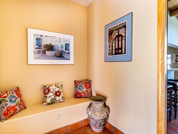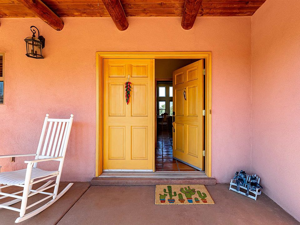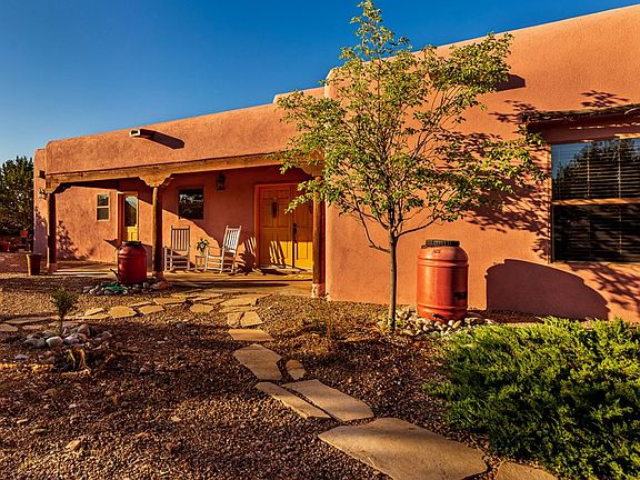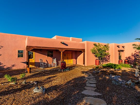 8 Don Jose Loop has much to offer in gracious and comfortable living in the high desert. Sited on 6.4 pinon and juniper laden acres, this single level house has been designed to take full advantage of the southern views and ever changing play of light on the Ortiz Mountains. In the centrally located great room, family and friends can gather by the fireplace or around the long bar top in the open concept kitchen. The kitchen opens to a butler's pantry with direct access to the front portal and walled garden for easy outdoor entertainment. Of the three bedrooms, there is a master and junior suite with adjoining baths. The junior suite, currently used as an office and separate from the other bedrooms, would be a wonderfully private guest bedroom or well suited to house a teen. In addition, the house has ample storage, including built in bookshelves. Many upgrades have been added by the seller including a laundry room, updated baths and lighting, a whole house water filtration system, ground mounted solar voltaic panels and arroyo erosion stabilization by The Rain Catcher. But best of all is the 1,131 sf heated out building. Built of steel and with soaring ceilings, roll up doors, 220v electricity and water, the possibilities are endless with this building, located a short, level walk or drive from the house. A dream for artists, artisans or for a business owner to store equipment and supplies, this building rounds out the property's many positive attributes.