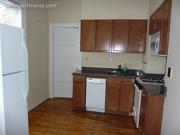 New kitchen. Granite counters. Gas stove. Dishwasher. Microhood. - Spacious rooms. High ceilings. Wood floors. - Newer windows. Gas heat. - Laundry in basement. Off street parking spot available for $ 125 per month.