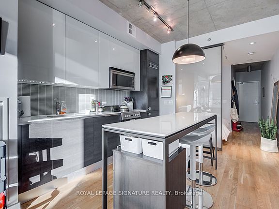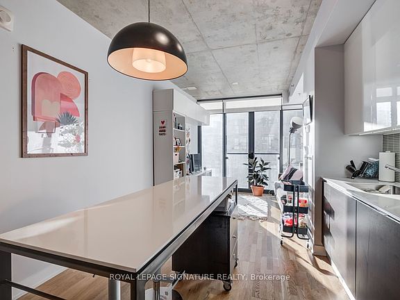 Welcome to Art Condos, one of Toronto's most admired boutique residences, known for its award-winning architecture and modern design. Nestled just steps from Queen West, this location offers the perfect blend of culture, convenience, and community. Enjoy being surrounded by trendy cafes, restaurants, galleries, nightlife, shopping, and easy access to TTC, Liberty Village, and Trinity Bellwoods Park. This beautifully designed suite features 10-foot ceilings, an open-concept layout, enjoy an airy, loft-like space. The European-inspired kitchen boasts integrated appliances, sleek cabinetry, and a versatile island with storage, perfect for both everyday living and entertaining. Floor-to-ceiling windows bathe the space in natural light. Other highlights include exposed concrete ceilings, engineered hardwood floors, ensuite laundry, and thoughtful storage solutions. Discover modern urban living in one of Toronto's most dynamic neighbourhoods-this is Queen West at its best.