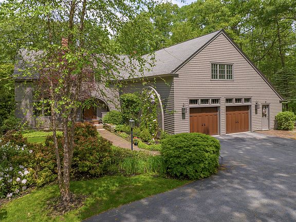Tucked into a private, wooded setting, this custom home at Dyer Pond is a blend of timeless shingle-style architecture and contemporary design. Architecturally-designed, the floor plan combines spaciousness with functionality. Interior appointments are a testament to impeccable craftsmanship and attention to detail. A flow of 12 rooms includes 4 bedrooms and 4 full baths. The first floor features the primary bedroom suite with full bath & office alcove. Half-moon shaped sunroom and 2-family rooms provide versatile spaces for relaxation and entertainment. There are ample spaces for study and office work. At the center of the living space is a recent, custom-designed kitchen by Centerline Design. Featured are exquisite red birch and painted cabinetry, soapstone counters and top-of-the-line appliances. Every detail has been crafted to create a workspace, that blends style and functionality. A generously-sized center island serves as a natural gathering place for dining and entertaining. Soaring ceilings create an airy and open feel, while built-in cabinetry, bookcases, and architectural niches add richness. Above the oversized garage, and on the second floor, generous storage areas provide the possibility for future expansion and customization. The sunroom is equipped with heat pump for cooling. An understated exterior facade of shingle and stone merges with the surrounding wooded setting. Veranda, stone patio, and bluestone walkways enhance the natural beauty of the site. It's just a short stroll to the shore and beach at nearby Ft. Williams Park, and steps to Cape Elizabeth's trail system.