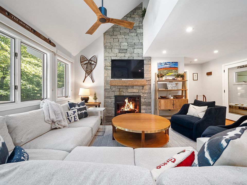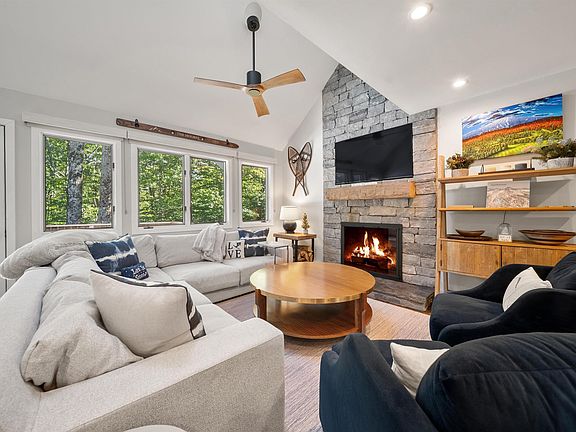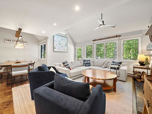 Rare 5BR/4BA Stratton Townhome | Ski-Back Access | Designer Furnished | Spacious, fully renovated 5-bedroom, 4-bath townhome at Stratton with ski-back access. Professionally designed and furnished by ACK Design, this move-in-ready home blends mountain charm with modern finishes. The main level features hardwood floors, a stunning floor-to-ceiling stone fireplace, and a granite kitchen with breakfast bar. Three levels of living include an en suite bedroom on each, offering comfort and flexibility for family and guests. Stay comfortable year-round with new mini-split systems in the living area and all bedrooms for efficient, customizable heating and cooling. Enjoy high-end upgrades like stone vanities, tiled baths, solid wood doors, and updated appliances. A dedicated ski room with custom lockers and ample storage keeps gear organized and out of the way. Step onto the deck to relax in your private hot tub surrounded by serene woodland views. In summer, enjoy access to the pool, paddle tennis, and clubhouse. In winter, hop on the shuttle at your door—or ski back via trails just across the street. An active Stratton Sports Center bond is in place and transferable with buyer-paid fee, offering access to premium fitness and recreation. This turnkey property offers rare space, comfort, and location—perfect for all-season Stratton living.