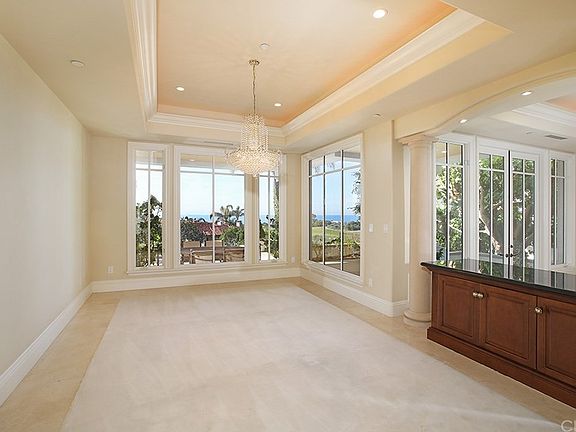 Elegant estate perched directly above Pelican Hill Golf course with panoramic ocean, harbor and Catalina views. This executive residence is located in the exclusive and highly sought after neighborhood of Pelican Hill in Newport Coast. This stunning estate boasts just over 4600 square feet of premier living space to include 6 Bedrooms, 4.5 Bathrooms, Bonus room, executive office, walk-in wine cellar and laundry room. Tasteful courtyard entrance opens to the dramatic 2-story foyer. Gourmet kitchen, formal living room, formal and informal dining, and family room showcase extraordinary panoramic ocean and Catalina Island views. Expansive ocean view master suite with fireplace and french doors and attached balcony. Master bathroom features marble floors, double separate vanities, large bathtub, oversized glass shower plus 2 generous walk-in closets. Yard includes a beautiful private infinity pool, secluded spa, ample outdoor covered dining and lounging space, built in BBQ, private gated courtyard, elegant landscape, citrus trees, and gazebo. Three car garage fronted by a private gated interior driveway. Come live life you intend in beautiful Pelican Hills.