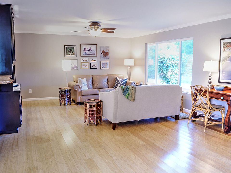 Bamboo flooring in living space and bedrooms. Tile kitchen and baths. Kitchen has self closing cabinets and gorgeous black granite counters. Live wood bar connecting living area and built-in wall cabinet. Large master bedroom with ensuite double vanity and walk-in shower. Guest bath with new vanity. Front loading Washer and Dryer in utility room. Low maintenance backyard, extended patio and deck outside master bedroom slider. Great home for living, entertaining and excursions to Bidwell Park. Credit score requirement 660 and above. Owner provides pest control and yard maintenance. No Smoking Permitted.