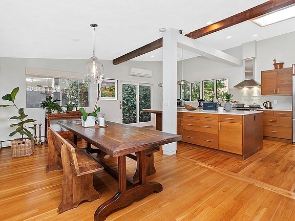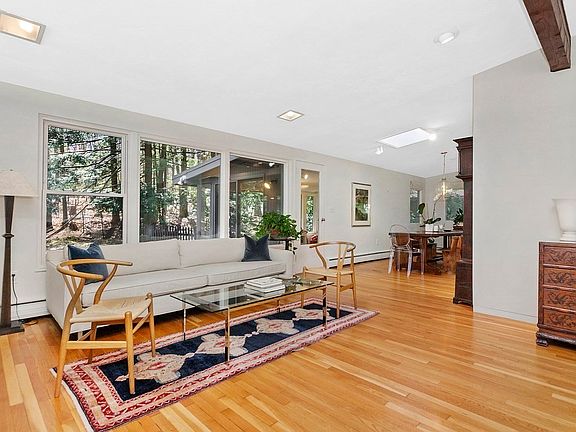 Gorgeous Mid-Century Modern in Upper Turning Mill. Beautifully renovated living spaces and multiple outdoor areas for entertaining, gardening, or relaxing. Open floor plan w/ exposed beams, vaulted ceiling, picture windows and skylights. Chef's kitchen w/ stainless appliances, gas cooking, custom cabinets, and huge quartz island. This home offers flexible floor planning with different options for bedrooms, offices and/or a den and family room. Master bed has a half bath en suite, and there are two tastefully renovated full baths. There are mini-split AC's, hardwood, parquet and cork floors, laundry room, and outdoor shed. Easy highway access, close proximity to conservation areas for hiking/biking, community pool, and local bus route.