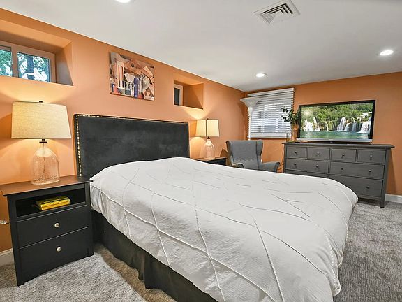 Downstairs, the finished lower level features carpeted flooring, a third bedroom, full bathroom, and a large bonus room ideal for a home office, or gym.