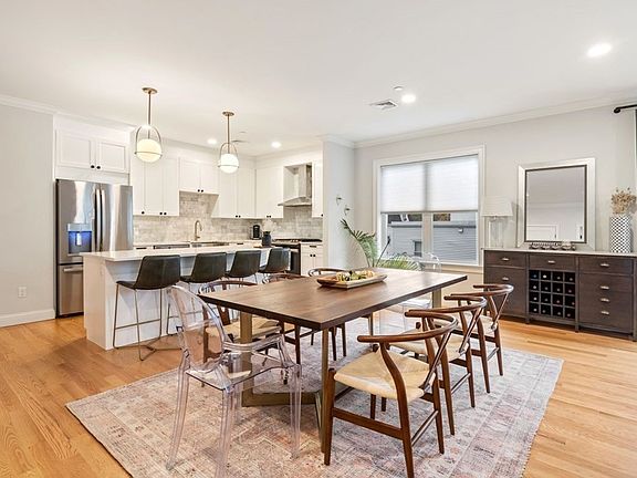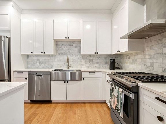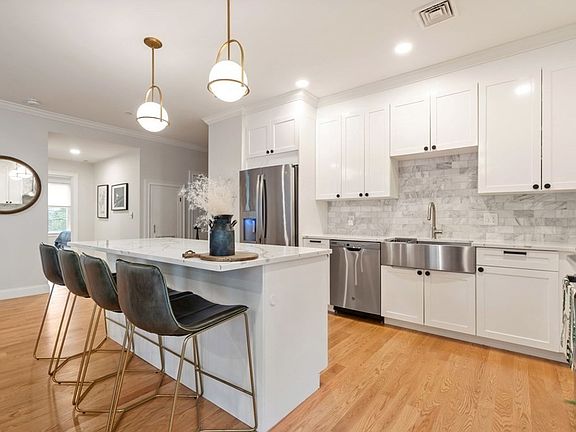 This stunning 2020 build is beautiful and functional. A tremendous location, on a dead end street, sitting .4 miles to the Melrose Highlands Commuter Rail stop and .2 miles to Whole Foods. Natural light pours through the oversized windows and juliet balcony, and the expansive open floor plan has hardwood floors throughout, 9 ft ceilings, central air, great closet space, and a perfect layout. The gorgeous kitchen has soft close cabinets, stainless farmers sink, marble backsplash, quartz countertops, GE appliances, vented out hood, and large island complete with built in microwave. The open living space has room for a dining table and stylish laundry closet. The large primary bedroom boasts an amazing walk in closet and ensuite bath complete with a double vanity and marble walk in shower. A coveted covered parking spot as well as plenty of options for visitor parking, shared and fully equipped patio space, and extra storage in the basement, leaves nothing to be desired.