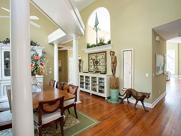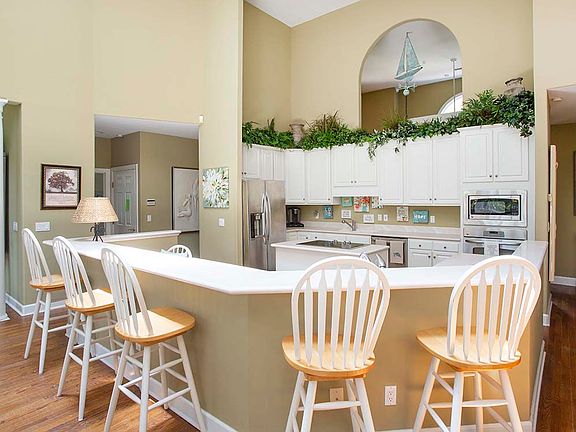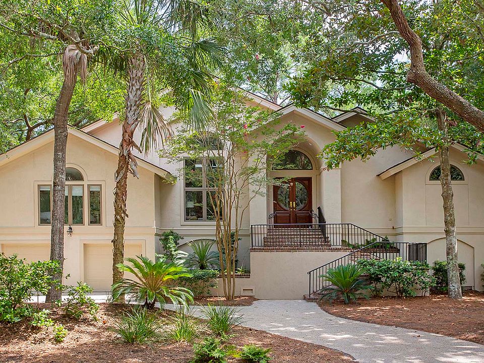 8 Greensward Road is a one-story home with stunning fairway and lagoon views located just a short bike ride from Kiawah's beach, the Sandcastle, and the new world-class amenities of West Beach Village. - Convenient single-level living - A two-story great room and high ceilings throughout - A private deck off of the master suite overlooks the lush green views - A spacious home office suite with tray ceiling and fireplace Beautifully sited on a tree-shaded lane overlooking the Cougar Point golf course, 8 Greensward Road delights from the moment you step onto its barrel-ceilinged front porch and into the foyer. The dining room, with floor-to-ceiling windows topped with an eyebrow transom, lies to your left. Straight ahead is the sunny great room. The expansive two-story living room and kitchen are open to each other. The living room features a fireplace and windows showcasing the water and golf views, plus a sitting alcove with floor-to-ceiling windows. Both offer their own glass doors to the rear sundeck with its lovely views, perfect for al fresco dining. The spacious kitchen features white cabinetry, a center island with cooktop, a wide breakfast bar, and stainless steel appliances. The master suite is bright with windows on two walls as well as glass doors leading to a private deck overlooking the lagoon and fairway. In the master bath is an expansive walk-in shower and his-and-hers sinks beneath a vaulted ceiling. Three spacious guest bedrooms, two with their own baths, and a laundry room complete this home.