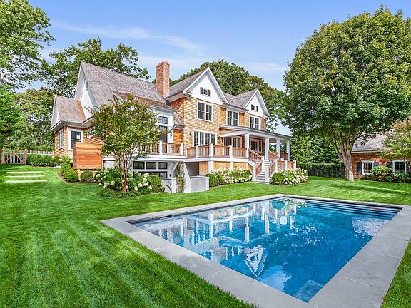 square foot impeccably designed modern interior for living and entertaining, and extensive mahogany decking for enjoying the outdoors. A heated gunite swimming pool enhances the resort-like experience amidst a peaceful setting, with room for a separate pool house as well. Cedar shake and clapboard siding, a cedar roof, and Marvin Integrity windows are among the many premium features defining the high level of materials and craftsmanship of this elegant home. State-of-the-art wiring for speakers inside and out, a Lutron home automation system, central vacuum, top-grade mechanicals including 3-zone HVAC, and a security alarm system take luxury and convenience to a whole new level. The stunning main level, introduced by a dramatic 2-story entry foyer, offers spacious sun-filled living and dining areas with airy 9' ceilings, 2 wood-burning fireplaces, and a fabulous chef's kitchen for hosting guests with ease. Refresh and renew in the tranquil first-floor master suite with soaring ceilings, custom closets, and an accompanying spa bath with radiant heated floors. Occupying the second story is a junior master suite, plus additional sleeping quarters and refined baths for your guests. The finished lower level with 10' ceilings extends the living space, and offers 1+ bedrooms, 2 bathrooms, recreation room, and access to the pool area and lower level patio. Topping the allure of this special new construction home is first and second-floor laundry areas, and a detached 2-car garage with a storage loft above. Don't miss your chance to see, rent and own this exceptional beauty. Newly listed.