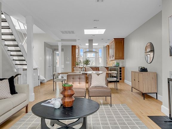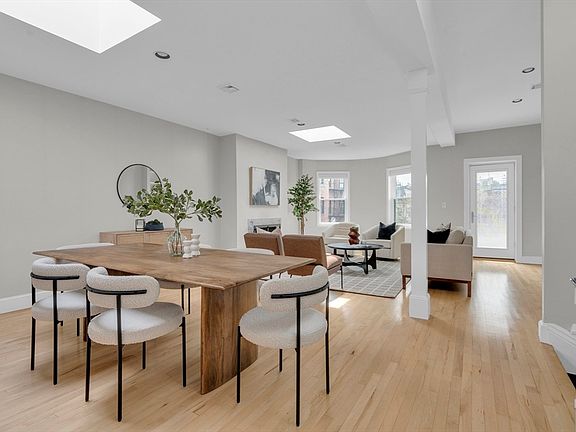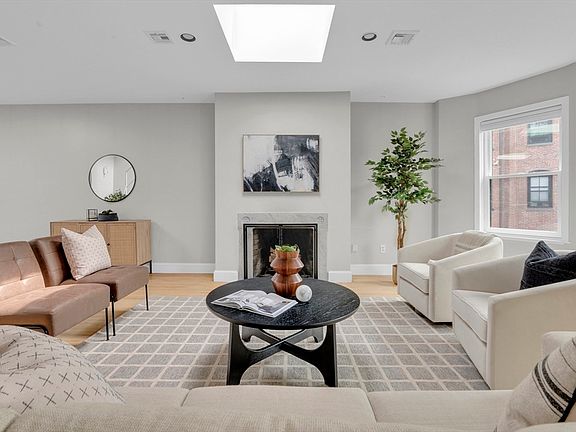 Stunning 3-bed/2.5-bath penthouse duplex overlooking picturesque Greenwich Park boasts elegant design, high ceilings, and abundant natural light. Expansive living/dining/kitchen area features hardwood floors, wood fireplace, and three skylights for a bright, airy feel. Step onto the private balcony for morning coffee, or head up to the roof deck with panoramic views of the Back Bay skyline. Modern chef's kitchen includes a 5-burner Thermador range and wine fridge, beautiful wood cabinetry with pantry storage, and granite counters. A lovely breakfast nook overlooks charming South End scenery. Three bedrooms downstairs include a lavish main suite with spa tub. Both floors benefit from three exposures with new windows. Additional features include plenty of closet space, newer furnace, central AC, plus one parking spot included. With the Southwest Corridor walk/jog/bike path and Colette Bakery right outside your door, experience urban living steps from Back Bay and South End amenities.