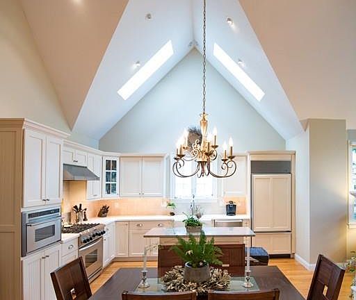 - Kit Dscrp: Pantry, Flooring - Hardwood, Countertops - Stone/Granite/Solid, Cabinets - Upgraded, Skylight, Kitchen Island, Stainless Steel Appliances, Recessed Lighting