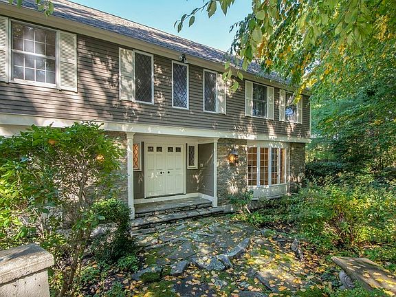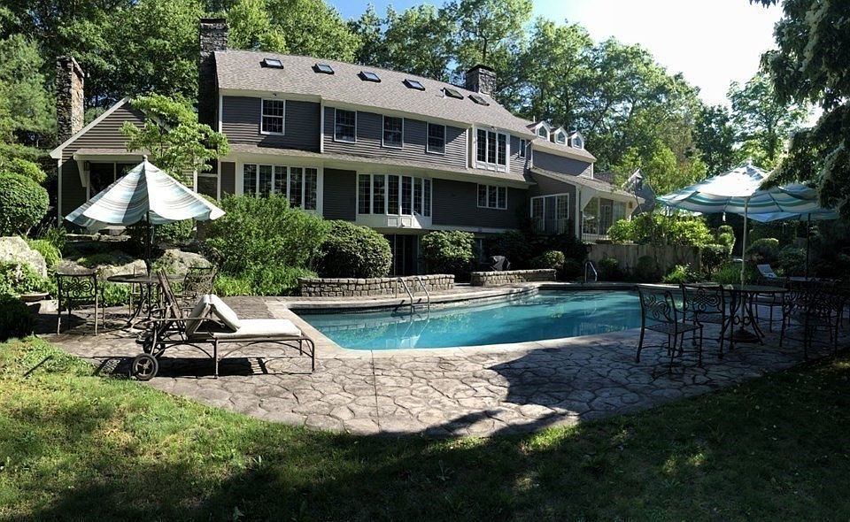 Amazing space to create your own style and boast family holidays and celebrations. Located on a private 2+ acre lot at the end of a cul-de-sac surrounded by conservation, there are unique and special details throughout. Expansive main level has loads of windows & light and includes a huge eat-in kitchen with center island & fireplace, a classic study with built-ins & fireplace, front to back living room with walls of windows, formal dining room overlooking private backyard, heated sun room with sliders to pool area, plus pub/den with full bar & fireplace. Upstairs are spacious bedrooms, a bunk room with full bath and a primary suite with sitting room, fireplace & bath featuring twin vanities, twin showers and soaking tub. Walk out lower level boasts large family room with beautiful stone fireplace and sliders that access magnificent in-ground pool, plus a bedroom with full bath. 3 car garage. All that and more to love about this distinctive home in a wonderful neighborhood
