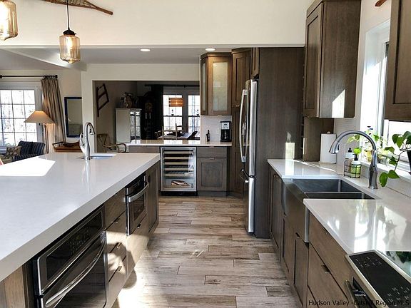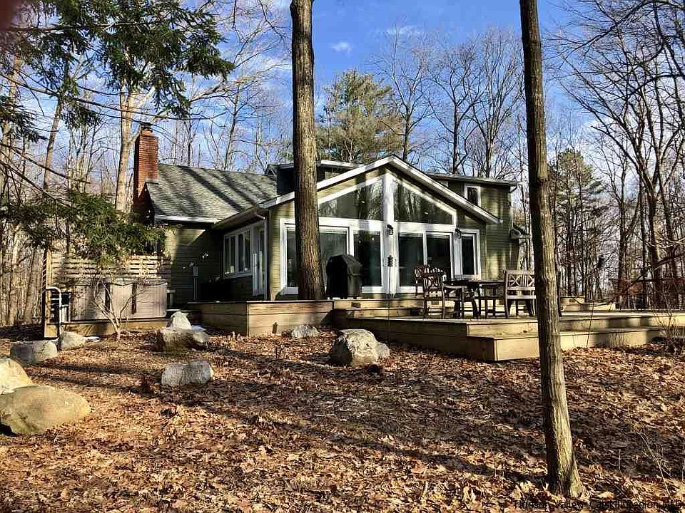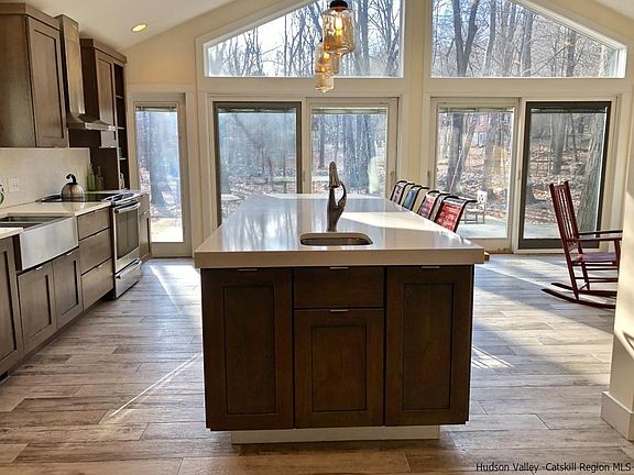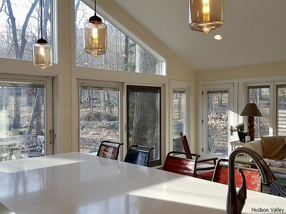 MOUNTAIN VIEWS thru the magical forest in a peaceful area near Mohonk Preserve. This Enchanting home welcomes you with open arms into a sun drenched modern day Chef's kitchen making meal preparation a breeze and conversations easy with a giant center island that is open to a sitting room and sliding glass doors to the 1200+ sq.ft. deck where you can enjoy the privacy of your hot tub while watching the sunset dance on the mountain. Come snuggle up to a roaring fire in front of the brick fireplace/woodstove in the sunken living room or enjoy a delicious meal in the informal dining room. The main floor two bedrooms share an updated bathroom with claw tub while the 2nd floor has jack and Jill bedroom plus a studio that is perfect for painting, meditating or doing yoga. Basement is a heated space plus a 2 car heated garage. Most of the house was renovated in 2015 including new heating system and CAC. Come play in nature while you enjoy the easy living this home offers in an area that is sought after.
