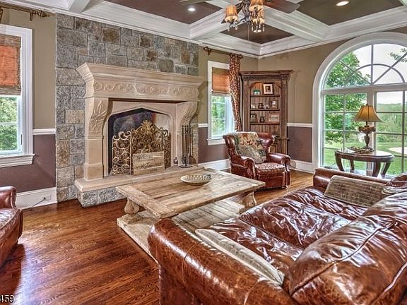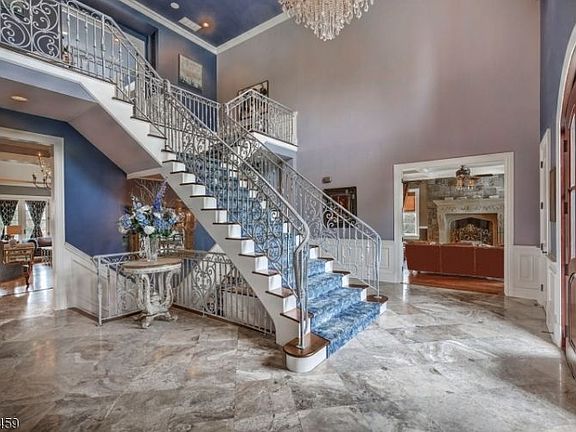 This EXTRAORDINARY custom designed home features an open floor plan where detailed and quality craftsmanship are evident throughout. Immediately impressive is the two-story foyer with breath-taking multi-tiered raindrop Chrystal chandelier remote lift, platinum- leaf wrought iron staircase, natural quarry stone flooring that leads into the professional chef's kitchen where "tools of the trade" include: Subzero cabinet enclosed refrigerator, ice maker, Viking 6-burner stove w grill and dual ovens. Stunning white kitchen cabinets, gray and white toner layered granite, custom millwork adorns every wall, limestone subway accent walls, and chocolate-stained hardwood floors make a statement. A heavenly primary bedroom suite with fireplace, luxurious bath spa area, radiant floors, his and her vanities, marble oversized shower, French doors to a stone a stone patio, with views to Manhattan. Every room integrates scenes of the sprawling backyard from the cascading windows while french doors from the family room lead to the expansive covered patio and open to the elegant indoor pool area. A Belgium block apron and porte cochere leads to a 4 car garage with an approval to finish an aupair in-law apartment. Its finished basement boasts 12 foot ceilings, French door walkout, white limestone stacked stone wall tile, and Trackman simulated sport golf center.
