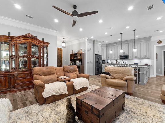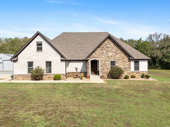 Tucked at the end of a long, private, tree-lined drive, this gorgeous 4-bedroom, 2 full bath, 2 half bath home offers modern design, thoughtful details, and peaceful country living on 6.81 acres. Inside, the open-concept layout features an electric fireplace, leathered granite countertops, a hidden pantry, and pull-out spice racks—perfect for both everyday living and entertaining. Each bedroom offers generous closet space with built-in pull-out drawers, while the large laundry room includes a sink, folding counter, and pull-out hamper cabinets for maximum convenience. The split-bedroom design ensures privacy, and the spacious upstairs bonus room with its own half bath offers endless possibilities as a guest suite, home office, or game room. Step outside to enjoy the covered back patio or the additional covered area off the shop, ideal for equipment or outdoor gatherings. The backyard is fenced for pets, leaving the remainder of the property beautifully open and framed by mature trees on three sides. A true standout, the 40x40 heated shop is wired with 240-volt electric, equipped with hard-wired heat, and includes its own half bath—providing endless opportunities.