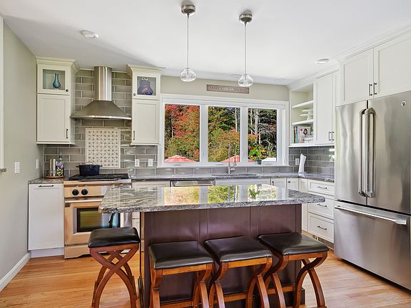 This beautifully updated colonial sits on a stunning 5-acre lot, offering the perfect blend of charm and modern amenities. The all-new chef's kitchen features a dual-fuel range, granite countertops, well-designed cabinetry, an island, and a pantry. The dining room with its bank of built-in cabinetry and beverage refrigerator make it perfect for hosting gatherings. The spacious great room boasts a striking beamed ceiling and a cozy wood stove. A bright four-season porch provides additional living space, while the front-to-back living room is versatile enough to serve as a den or home office. Upstairs, you'll find all-new carpeting throughout, a primary suite with double closets and an en-suite bathroom, plus three additional bedrooms and a recently updated full bath. Outside, enjoy the large heated inground pool with a brand-new liner and oversized patio area—perfect for entertaining. Mini-split systems provide air conditioning, and the two-car garage offers convenience. Nestled in a desirable neighborhood, this home is just minutes from schools, highways, shopping, and restaurants.